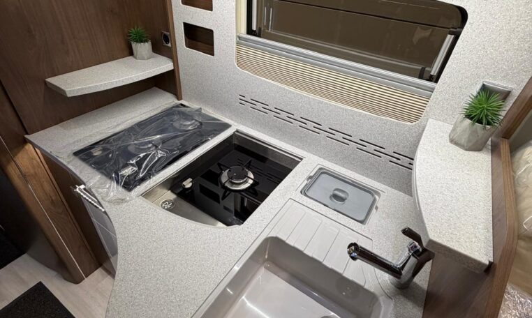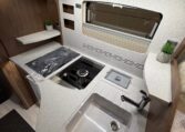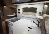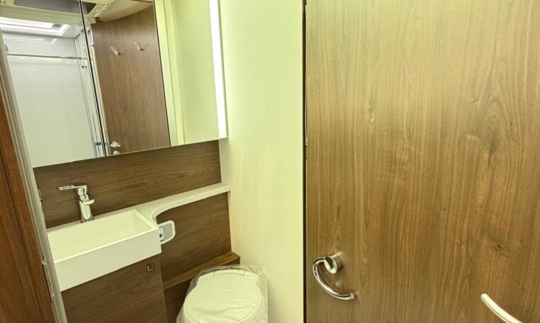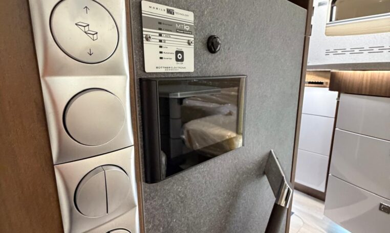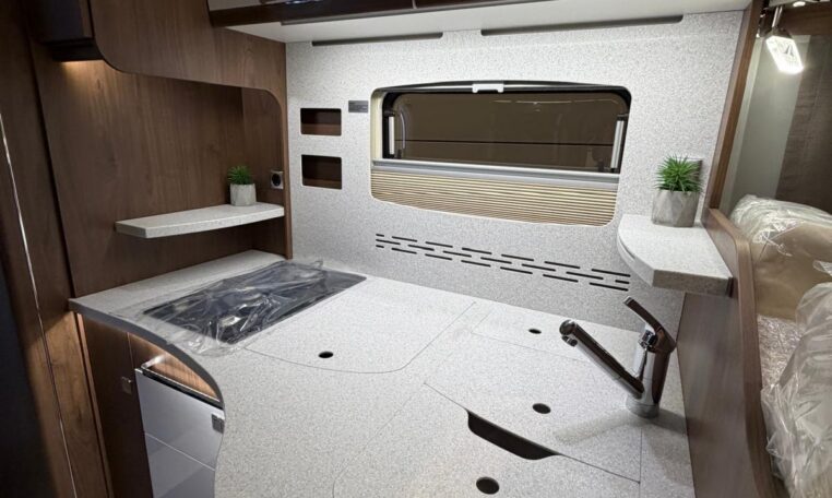 ENG: 93L diesel tank; Semi-automatic climate control; 250-A alternator; Leather steering wheel; Rain sensor; Steering wheel adjustable in height and depth; Electrical auxiliary chassis heater for faster heating of the interior; Thermo Guard Plus sidewalls; 11-year watertightness warranty; GFRP gelcoat roof – hail-resistant; Heated double floor with a height of 126/348 mm; Residential door and cabin door with central locking (with original vehicle key); Aluminum wheels at the front and aluminum covers at the rear; Double-glazed cab side windows; Electric blackout blinds instead of manual blackout blinds; Wifi Router and 4G antenna (for mobile internet); Electrical wastewater tank valve (for emptying); Additional 230 V sockets (5 pcs); additional USB sockets (2 pcs); Hydraulic support legs HPC Hydraulics (automatic leveling)