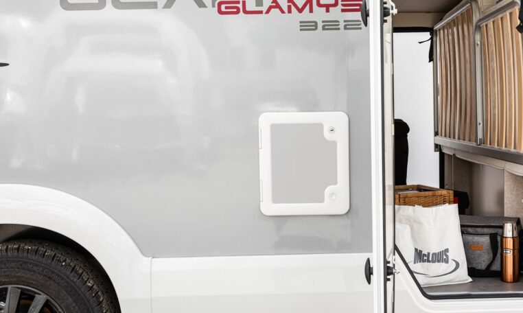 PAKETT GLAMYS = Välisuks 2 lukustuspunktiga, akna, prügikasti ja puldiga kesklukuga; 200 W päikesepaneel koos MPPT regulaatoriga; Kabiiniosa pimenduskardinad, TV-hoidik
