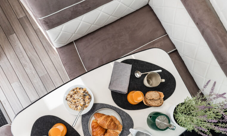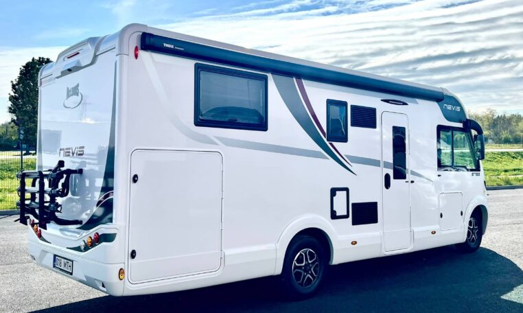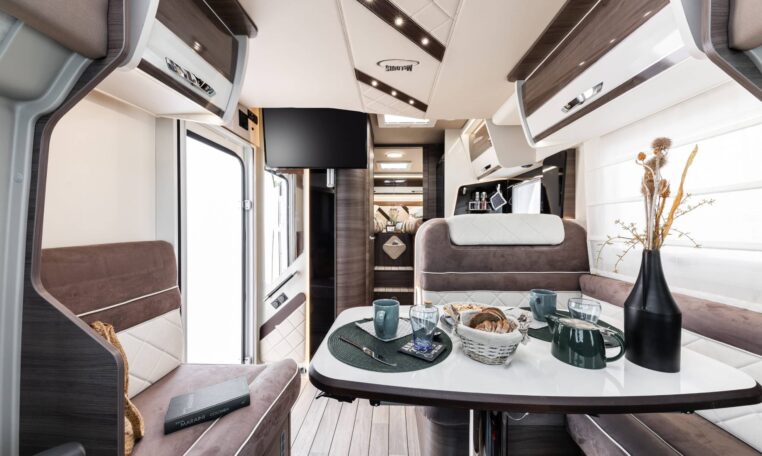ENG: TV holder for 32" TV; Table sliding and rotating 360°; Sleeping and living area partition rigid door; Soft touch vehicle roof and sleeping area walls; Extra comfort mattress with memory foam layer; Electric elevating system (Flexy space garage); Clothes hanger rail in the shower space; Illuminated and heated garage; Solar panel 200W; Rear-view camera with monitor; Steering wheel radio controls; TPMS; Leather steering wheel; Heated floor (230V shore current); Graywater tank with additional thermal insulation; Insulated step; Sink cover / Chopping board, Lithium Battery LiFePo4 120 Ah