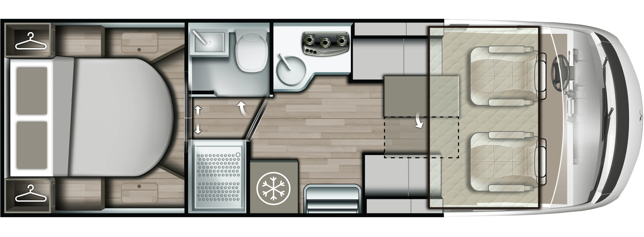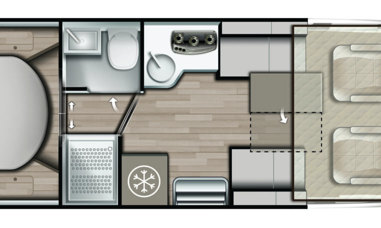 Laia voodiga magamistuba matkaauto tagaosas / Rear bedroom with wide double bed