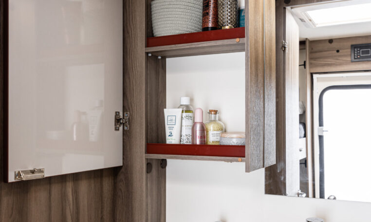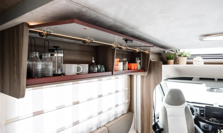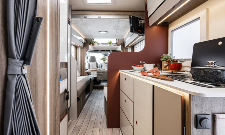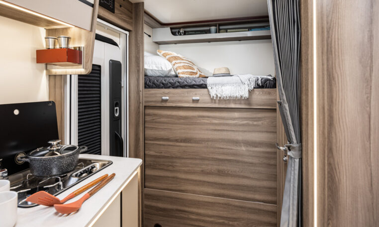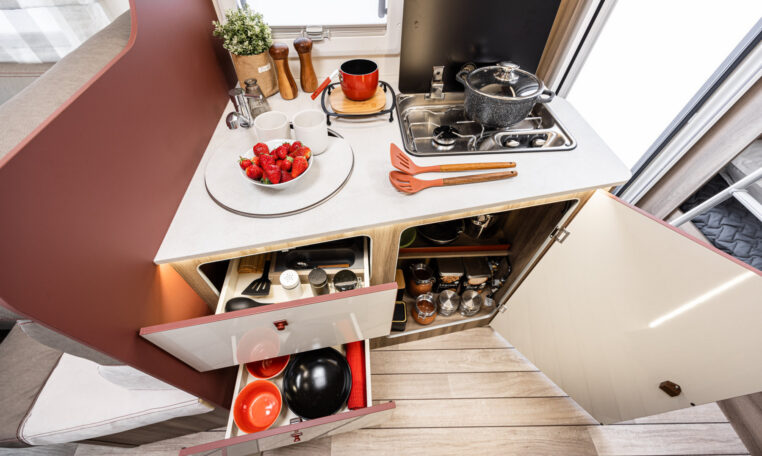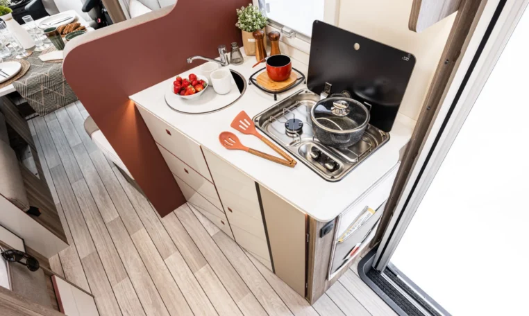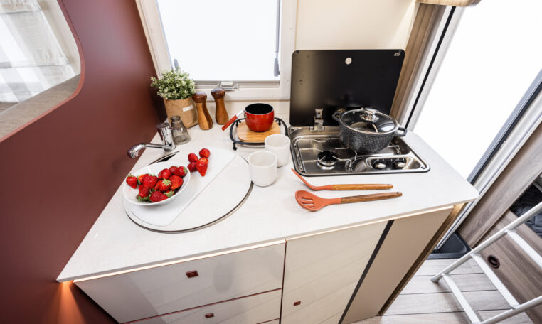 Kitchenette – 142 L refrigerator with freezer (gas + 12V + 220V), sink, gas stove