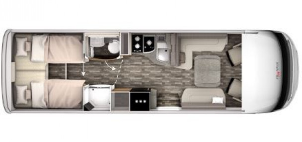 • Kahden hengen makuuhuone matkailuauton takana (yhdistetään leveään vuoteeseen)