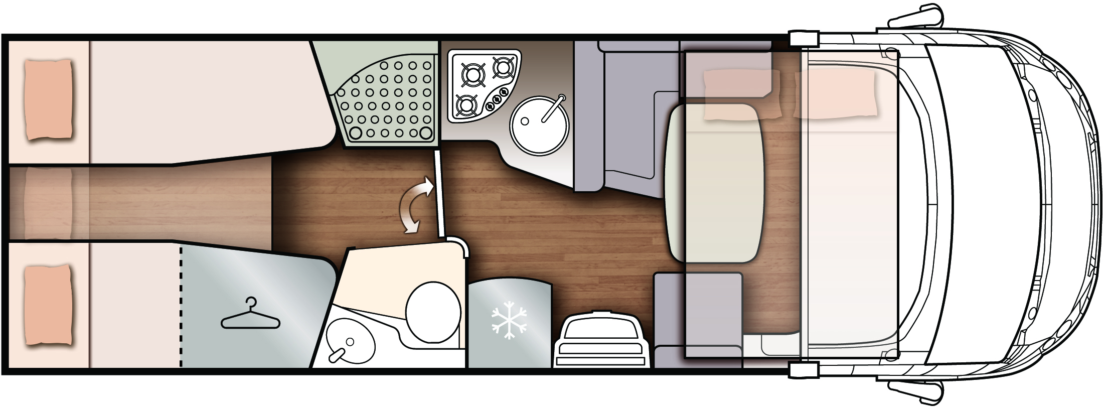 • Kahe eraldi voodiga magamistuba matkaauto tagaosas (ühendatav laiaks voodiks)