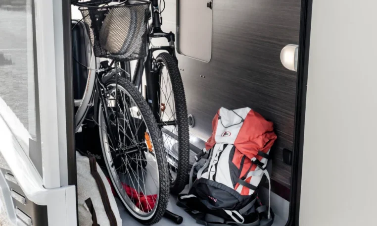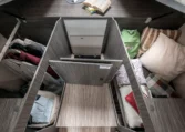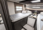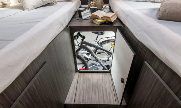 TV holder for 32" TV; Table sliding and rotating 360°; Sleeping and living area partition rigid door; Soft touch vehicle roof and sleeping area walls; Extra comfort mattress with memory foam layer; Electric elevating system (Flexy space garage); Clothes hanger rail in the shower space; LED interior lighting; Bus-type rear view mirrors; Illuminated and heated garage; Window in the bathroom; Traction+; Solar panel 200W; 16" alloy wheels; Rear-view camera with monitor; Steering wheel radio controls; Techno dashboard; Tyre pressure monitoring system; Leather coated steering wheel; Heated floor (230V shore current); Graywater tank with additional thermal insulation; Insulated step; Sink cover / Chopping board, Installed LiFePo4 120 Ah Lithium board battery