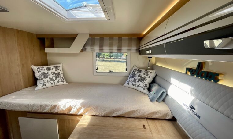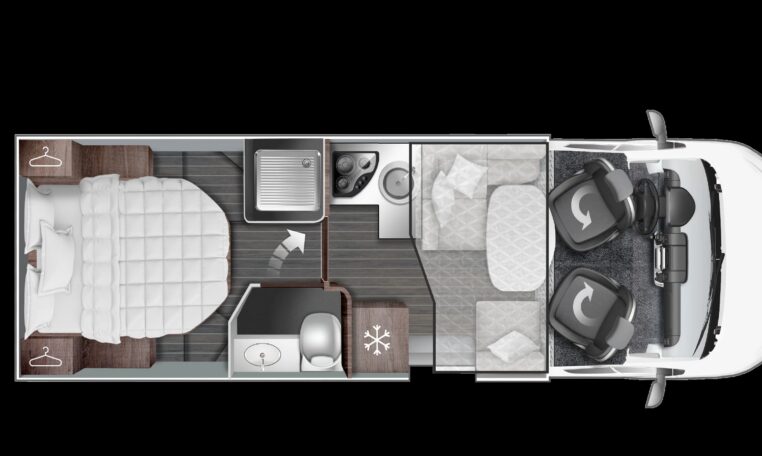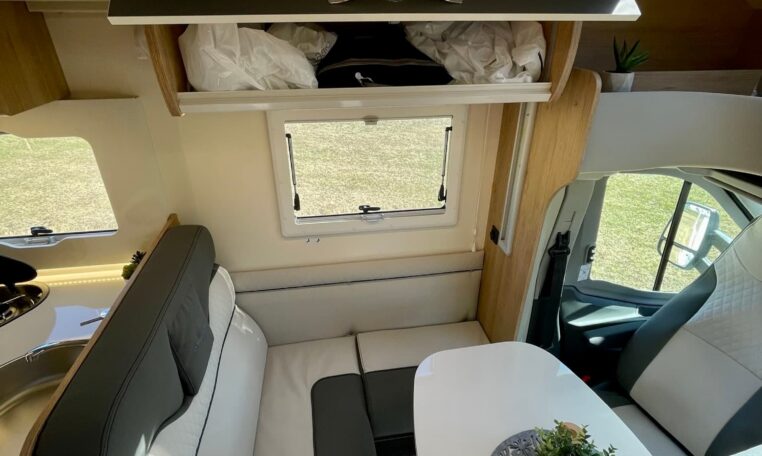 ENG: Imitation leather "SATIN" upholstery; Light furniture colour; Isofix; 24" TV arm, Pleated day/night separation curtain; High Series Headlamp with Static Bending; Locking Glove Box; Trend Interior Accent Pack; Full Body Front Colour Bumpers and Body Colour Side Mouldings; Electric Windshield Defroster; Adaptive Cruise Control with Lane Centering and Stop&Go; Pre-Collision Assist 2.2 (Mid Range Radar, Evasive Steer Assist and Distance Alert / Distance Indication, NCAP4*); Speed Sign Recognition, integrated with Adaptive Cruise Control; Power Heated Signal Mirrors; Navigation Center; XL entrance door with 2 locking points, with window, rubbish bin and central locking; Solar panel 200W; Pleated cabin blinds; Winter pack