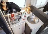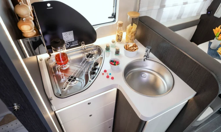 Kööginurk – külmkapp 142 liitrit koos sügavkülmikuga (gaas + 12v + 220v), valamu, gaasipliit